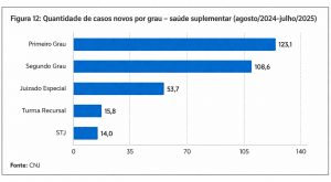 No mesmo período, a saúde suplementar respondeu por cerca de 41% das novas demandas judiciais em saúde, apesar de atender aproximadamente 25% da população brasileira.